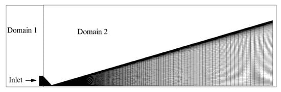 A structured grid was used for all the numerical simulations, and the structured grid is shown in Figure 1. The grid consisted of two blocks: the first block was the shock tube part, which was 300 mm away from the end of the shock tube, and the other was the nozzle part. The total number of grids was 168,000. The shock tube part included 51 × 161 grids, and the nozzle part contained 1000 × 161 grids. The system was used with Δxmin = 1 × 10−4 m located at the throat section, and Δymin = 2 × 10−8 m at the wall. Exponential compression was used in the radial direction. A grid convergence study was conducted with three different grid resolutions (79,775, 150,120, and 317,100), and a small change in pressure, species fraction, velocity, and Mach number distribution was registered. For each grid system, the y+ value was less than one.