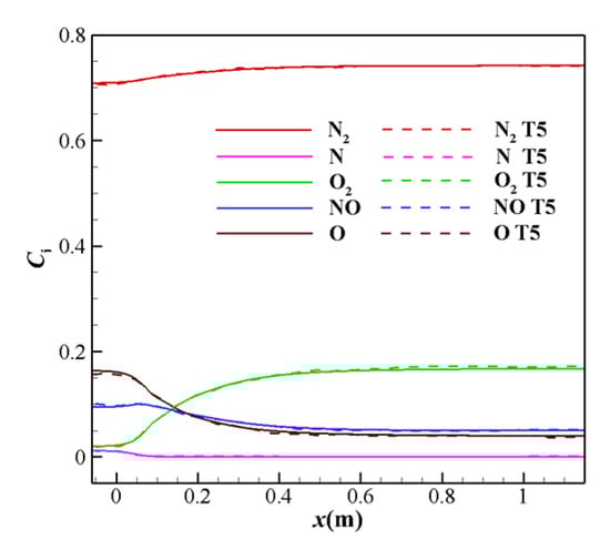 The 5-species 2-temperature (5S2T) model and the 7-species 2-temperature (7S2T) model were used to calculate the flow field of the T5 and HEG nozzles. For the T5 and HEG nozzles, the initial condition was based on Case 1 and Case 2 in Table 3, respectively. Figure 2 shows the comparison of the distribution of species mass fraction in the flow field [], using the same 5-species 2-temperature model as the reference. Table 5 and Table 6 show a comparison of the pressure and species mass fraction at the exit of the T5 and HEG nozzles. It is clear that the calculation results for the T5 and HEG nozzles are in good agreement with the reference values [,]. Compared to 5-species ions, the 7-species ions belong to the micro-species. Under the aforementioned conditions, the proportion of NO+ and e- in the mass of 7-species ions was less than 0.03% of the total mass compared to 5-species ions. The chemical energy of the micro-species was negligible relative to the total gas flow, so they did not affect the main flow and thermochemical parameters. This phenomenon is consistent with previous research results.