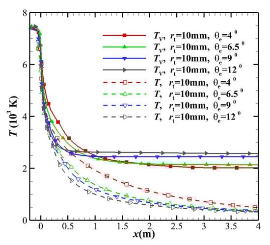 A comparison of Cases 1, 2 3, and 4 reveal the influence of the MEA θe on the thermochemical non-equilibrium effects. The translational temperature T and vibrational temperature Tv of the nozzle centerline are shown in Figure 3. It can be seen that the vibrational temperature Tv and the translational temperature T are the same before the throat, and the gas is in the thermodynamic equilibrium state. After passing through the throat at x = 0 m, Tv and T begin to differ, and the non-equilibrium vibrational phenomenon occurs. Then, as the gas velocity gradually increases, the vibrational temperature becomes constant (freezing point). Not far from the downstream of the nozzle throat, the larger MEA of the nozzle corresponds to a higher vibrational temperature but slightly lower translational temperature. The MEAs were 4°, 6.5°, 9°, and 12°, and the freezing temperatures were 2018 K, 2113 K, 2442 K, and 2623 K, respectively. The distances xf from the freezing point to the throat were 3.071, 1.576, 0.717, and 0.473 m. The freezing point diameters df of the corresponding nozzles were 0.438, 0.376, 0.254, and 0.220 m. The ratio df/dt of the freezing point diameter to the throat diameter was 21.9, 18.8, 12.7, and 11, respectively. The freezing point approaches the nozzle throat as the MEA increases. These phenomena can be explained as follows:
