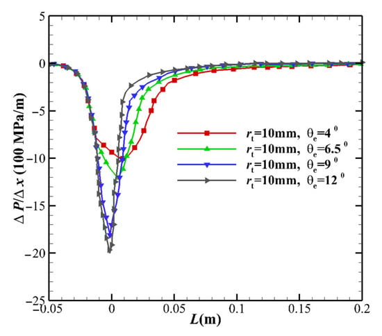 - As the MEA increases, the pressure gradient near the throat increases (see Figure 4), resulting in an increase in flow speed, as illustrated in Figure 5. As the pressure gradient increases, the pressure downstream of the throat decreases, which increases the TVERT, as deduced from Equation (25). Additionally, the increase in pressure gradient causes an increase in the flow velocity but a decrease in the flow time. Both shorten the transition from equilibrium to freezing, and the flow becomes close to the non-equilibrium flow.