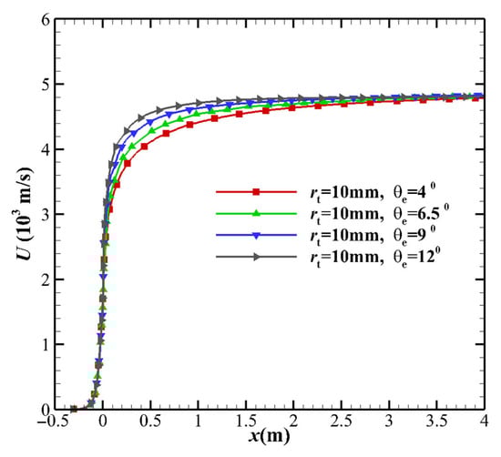 - The increase in the kinetic energy of the equilibrium flow originates from the translational kinetic energy and vibrational energy. Since the vibrational energy of the non-equilibrium flow freezes, the increase in the kinetic energy can only be attributed to the translational energy. As the TR increases, the velocity u at the throat decreases. The velocity u of the nozzle outlet is only related to the total enthalpy h of the nozzle stagnation gas, and the nozzle outlet velocity is almost the same (see Figure 8).