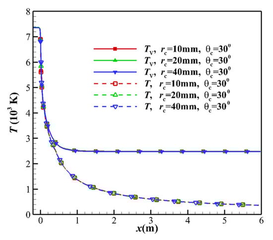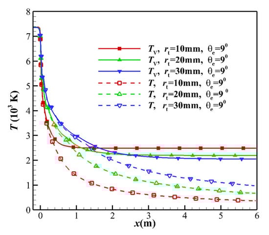 The thermochemical non-equilibrium scale effects were studied by changing the TR rt. Cases 3, 5, and 6 in Table 2 were selected, and the translational temperature T and vibrational temperature Tv are shown in Figure 6. In the downstream of the throat, the vibrational temperature and translational temperature are different. The separation point of the nozzle is also different. With the increase in the TR, the separation point and freezing point gradually move to the downstream of the nozzle. For the TR of 10, 20, and 30 mm, the freezing temperatures were 2442, 2207, and 2140 K, respectively. The distances xf from the freezing point to the throat were 0.717, 1.568, and 3.030 m. The freezing point diameters df of the corresponding nozzles were 0.254, 0.536, and 1.018 m. The ratio df/dt of the freezing point diameter to the throat diameter was 12.7, 13.4, and 16.9, respectively. As the TR increases, the freezing point moves away from the throat. These results can be explained in terms of the following.