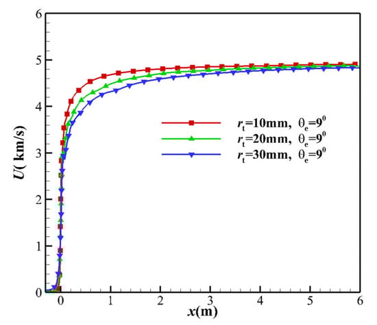 The flow field parameters in the centerline at nozzle outlet with the different throat radii rt.