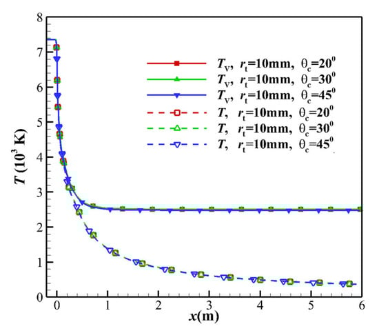 The contraction section and the throat were upstream of the freezing point of the high enthalpy nozzle. The CA θc and TCR rc were varied to investigate the thermochemical non-equilibrium effect. In the subsonic region upstream of the throat, the flow is the equilibrium state. The variation of nozzle geometry in the equilibrium flow area has almost no impact on the non-equilibrium effect of the flow field. Cases 3, 7, and 8 in Table 2 were selected to study the influence of CA on the non-equilibrium effects. The freezing position and vibrational temperature of the flow field are almost unchanged (see Figure 9). The change in the TCR has a minor impact on the non-equilibrium effect, and the freezing position and vibrational temperature of the flow field are almost unchanged. The calculation results of cases 3, 9, and 10 are shown in Figure 10. As the airflow passes through the throat, the non-equilibrium effects begin to increase, and the flow freezes quickly downstream of the throat.