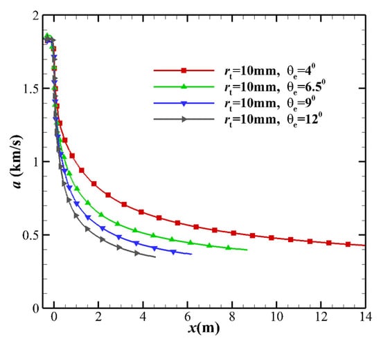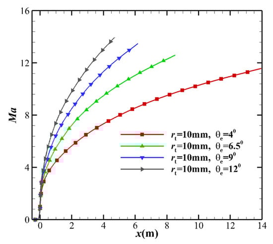 To study the influence of the MEA on the Mach number, cases 1, 2, 3, and 4 in Table 2 were selected. The centerline Mach number distribution is shown in Figure 11. With the increase in the MEA, the Mach number gradually decreases. This is because the translational temperature increases, and the local sound speed gradually increases (see Figure 12). Equation (27) shows that the sound speed has some dependence on the pressure gradient in the stream direction.