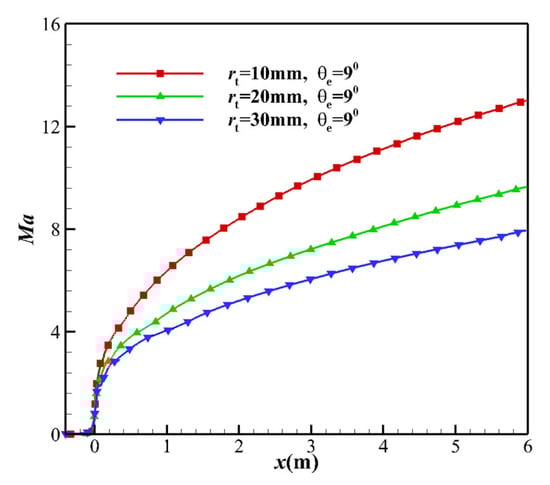 Although the high enthalpy nozzle is mainly used to simulate the speed and pressure of the flying objects, the Mach number is also a key parameter. It has been proved that changes in the MEA and TR can influence the non-equilibrium effect. Now, we discuss the effects of changes in the MEA and TR on the Mach number.