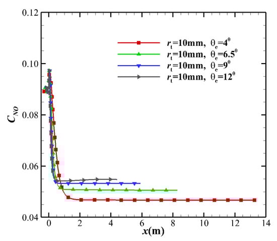 Cases 1, 2, 3, and 4 in Table 2 were selected to study the influence of the MEA on the species mass fraction. Figure 14 shows the centerline evolution of NO mass fraction. It can be seen that the flow freezes not far from the downstream of the throat. The variation in the MEA also changes the dissociation of NO. Considering the influence of MEA on the vibrational temperature, the variation of NO mass fraction can reflect the effect of vibrational temperature on the dissociation. As the MEA increases, the freezing point approaches the throat, and the NO mass fraction increases. The non-monotonic change of NO along the centerline upstream of the throat is caused by the non-monotonic change of NO with temperature. For example, in the equilibrium air composition at 1 atmospheric pressure, the temperature range of NO is 2000–6000 K, and the corresponding peak temperature is approximately 3500 K []. Under the conditions considered in this paper, the pressure at the upstream of the throat is high, and the temperature range and peak value of NO correspond to the temperature rise. The peak value of NO is nearly 5000 K. Figure 15 shows that the mass fraction distribution of O2 and O is also significantly affected by the different MEAs. The remaining flow field parameters are listed in Table 7. As the MEA increases, the flow field parameters tend to be in non-equilibrium state. The mass fractions of dissociating species such as NO, N, and O increase, while those of of N2 and O2 decrease. The influence of the different TRs on the flow field parameters is also shown in Table 8. As the TR increases, the nozzle flow field parameters are biased to the equilibrium state.