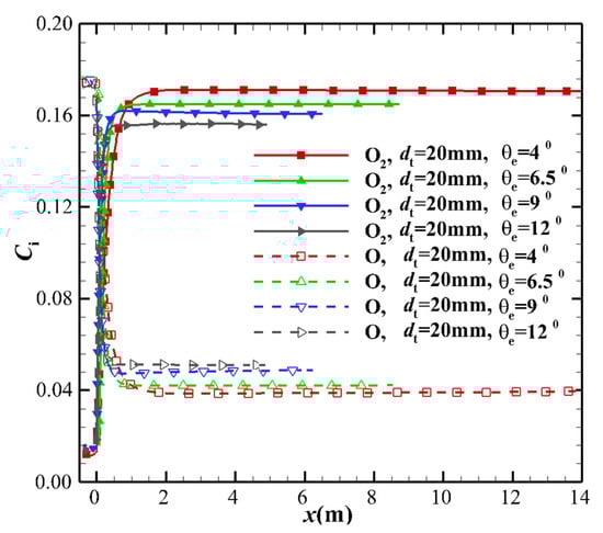 Comparison of centerline O2 and O mass fraction distribution for nozzles with different MEAs.