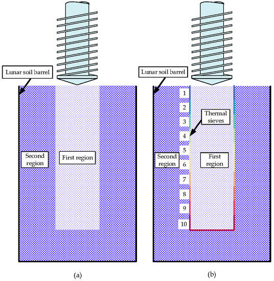 Cui Jinsheng, from Guangzhou University, conducted a study on the thermal characteristics and temperature distribution of simulated lunar soil under atmospheric pressure and vacuum conditions, using the DEM [15,20]. However, the large number of simulated particles required for establishing the simulated lunar soil lead to a very long simulation time. To overcome this problem and ensure a certain level of simulation accuracy, Cui proposed a multi-level particle size simulation model, as shown in Figure 1a. The variable particle diameter refers to the large variation in particle diameter in different regions. The basic idea is to divide the simulated lunar soil into several regions. The first region is the region directly interacting with the drilling tool and its vicinity. The remaining simulated lunar soil is then divided into two or three regions from the inside to the outside. The simulated lunar soil in these regions mainly acts as a boundary condition, and is subject to small stress and weak mobility. Because the particles in the first region come into direct contact with the drilling tool, the temperature increase is greater during the drilling process. Therefore, filling the first region with small particles may better reflect the temperature changes during the drilling process. The particles in the second region are far away from the drilling tool and have a lesser temperature increase. The heat transfer in this region is mainly related to the thermal conductivity of particles, and is almost independent of particle size. Therefore, using large particles in this region can reduce the number of particles. This not only reduces the amount of calculation and saves the calculation time, but also does not significantly affect the simulation accuracy.