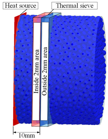 To analyze the influence of the thermal conductivity and specific heat capacity of the thermal sieve on particle heat transfer, a parameter-matching simulation model is established, as shown in Figure 2. The model consists of particles with a diameter of 0.6 mm, placed in an insulated cylinder with a diameter and length of 30 mm. The front plate of the cylinder is set as the heat source, with a temperature of 700 °C, while the cylinder temperature is set at −196 °C and insulated. The thermal sieve is placed 10 mm away from the front plate, with an initial temperature of −196℃ for both the sieve and particles.