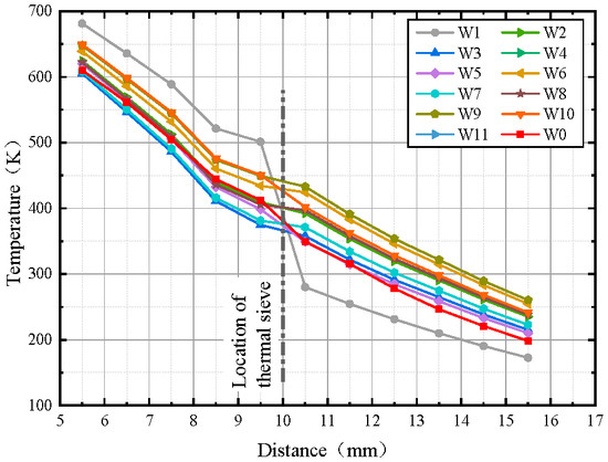 The specific heat capacity has little influence on the temperature difference, so it is not considered when matching the thermal conductivity of the sieve. According to the W0 group test data, the Td is about 92.4 K without the sieve, and the specific heat capacity of the sieve is set at 1200 J/kg °C temporarily. Using Formula (6), the thermal conductivity of the sieve is estimated to be about 144 W/m K.