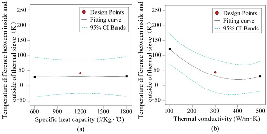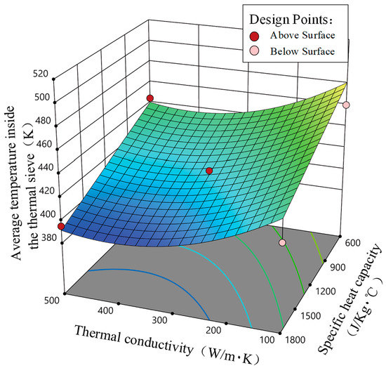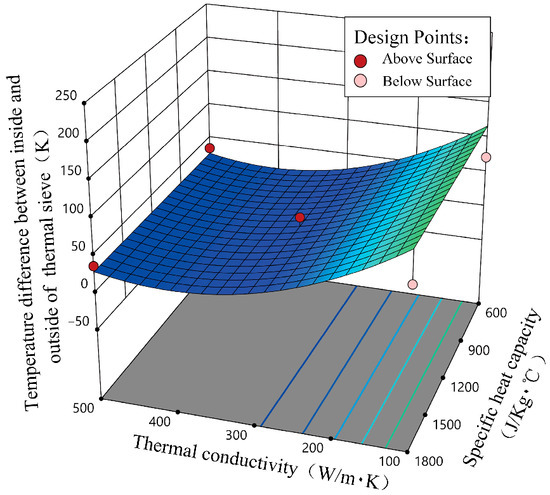 The temperature difference, Td, between the inside and outside of the thermal sieve, initially decreases and then increases as the heat conductivity of the sieve increases. This relationship is largely independent of the specific heat capacity of the sieve. To determine the relationship between Td and the parameters of the thermal sieve, the test results were fitted using a quadratic regression equation with experimental design software (Design-Expert):