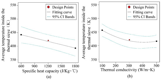 Figure 3 displays the simulation test results. The abscissa denotes the distance from the heat source, and the ordinate denotes the average temperature at the distance. The particle temperature variation trend is consistent outside the 2 mm area. The addition of a thermal sieve has a significant effect on temperature change near the sieve, as depicted in Figure 4 and Figure 5. Design points represent data points for simulation. The upper surface design point indicates that the simulation result is higher than the fitting result, that is, the data points are above the fitting surface. The lower surface design point indicates that the simulation result is lower than the fitting result, below the fitting surface. The dotted line in Figure 5 represents a 95% confidence interval.