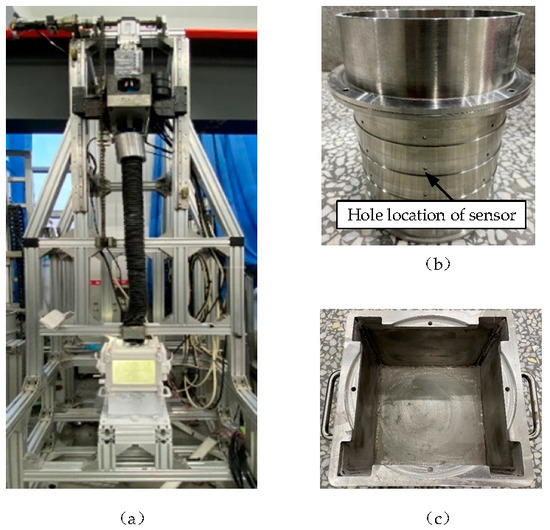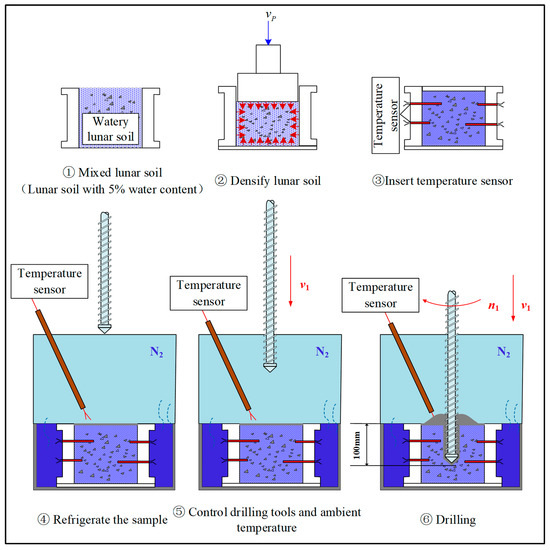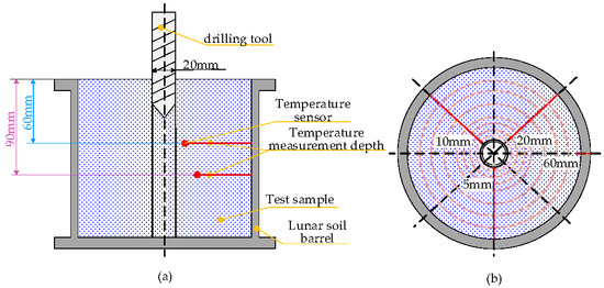 The drilling experiment equipment is depicted in Figure 8a. The temperature sensor is positioned at the hole of the side wall of the lunar soil barrel, as shown in Figure 8b. The liquid nitrogen barrel shown in Figure 8c is used to maintain the low temperature environment of the drilling area by using nitrogen and to prevent external factors from affecting the experiment. The inner diameter of the lunar soil barrel is 70 mm, and the depth is 150 mm, which is consistent with the simulated lunar soil barrel size. The soil barrel temperature sensors for this experiment month are arranged in two layers, with four sensors arranged on each layer. The layout of the temperature sensors is shown in Figure 9. The numerical value in Figure 9b shows the distance between the sensor temperature measurement point and the surface of the drilling tool. One sensor is also positioned in the chip removal accumulation area to measure the temperature change of the chip removal. The experiment process is shown in Figure 10.