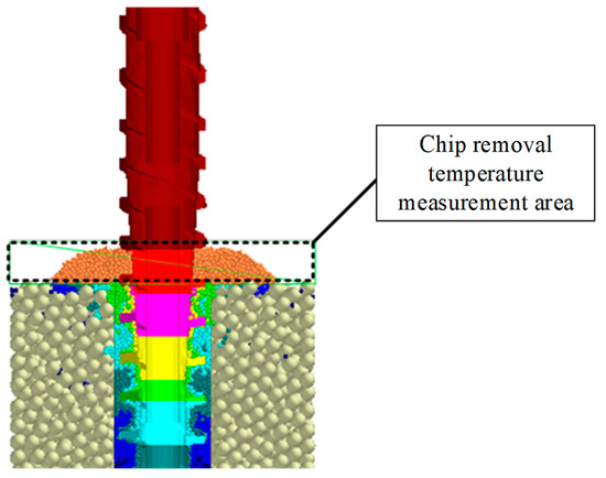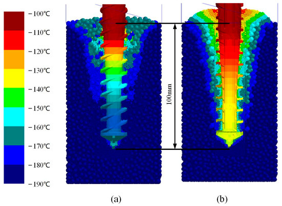 Figure 12 illustrates the temperature distribution when the drilling depth is 100 mm. Figure 12a displays the case without thermal sieve. In this case, the particles in the first and second areas are mixed. In comparation with Figure 12b, there are fewer particles in the temperature measurement area of chip removal, and the particle temperature is significantly lower. The state of the debris dump in Figure 12b is basically the same as that generated by drilling the simulated lunar icy regolith [23]. As the icy regolith in the drilling area is constrained by the outer icy regolith, it is discharged upwards during actual drilling. The movement limitation on particles in the drilling area, caused by the thermal sieve, may make the simulation closer to the actual drilling and better reflect the temperature changes in the particles. Therefore, Figure 12b is more consistent with actual drilling.