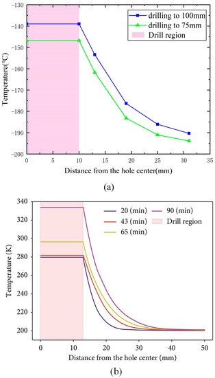 Figure 13a shows the radial temperature distribution at a depth of 25 mm, when drilling to 75 mm and 100 mm. The X-axis represents the distance from the center of the drilling hole, the Y-axis represents the temperature corresponding to the distance, and the shaded red rectangle represents the drilling position. It can be seen that the temperature when drilling to 100 mm is generally higher than that when drilling to 75 mm, but the temperature distribution trends of both are basically the same. The temperature difference is mainly due to the longer drilling time as the drilling depth increases, resulting in an increase in the heating time at the same position. Figure 13b shows the radial temperature distribution at different times at a hole depth of 50 cm, obtained by Formisano through a finite element analysis [24]. The temperature distribution trends of both are the same. As the heating time increases, the temperature increases.