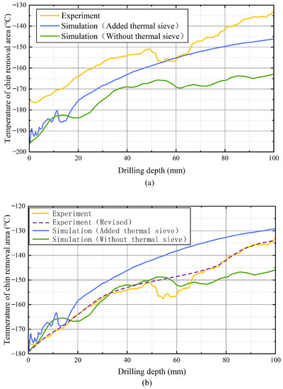 As shown in Figure 14, the temperature variation trend in the chip removal area measured in the experiment is almost the same as that in the simulated chip removal area. After the drilling depth exceeds 40 mm, the simulated temperature data without thermal sieves stop rising, and the data fluctuate significantly. This is in poor agreement with the experimental data. After adding the thermal sieve, when the drilling depth exceeds 20 mm, the temperature shows a stable upward trend, which is consistent with the experimental data trend. The temperature of the chip removal area simulated with the addition of the thermal sieve is higher than that simulated without the addition of a thermal sieve, and the difference between the two continues to increase after the drilling depth exceeds 40 mm. At the initial stage of the experiment, there was a temperature difference of 20 °C from the initial set temperature of the simulation. After removing the influence of the initial temperature difference, when drilling at a depth of 100 mm, the temperature deviation between the experimental chip removal area and the simulated chip removal area after adding a thermal sieve is about 5 °C, and the temperature deviation between the simulated chip removal area without heating the sieve is about 10 °C. When the drilling depth is around 50 mm, the experimental temperature value begins to decrease, because the experimental data are fixed point temperature values measured by a single temperature sensor, and not the average temperature of the chip removal area. Therefore, it is possible for the temperature sensor to come into contact with some low-temperature chip removal, causing certain errors. This is mainly due to the impact of measurement methods. The revised experimental data (dashed line) in Figure 14b represent the temperature data after eliminating the impact of the initial temperature difference and the temperature measurement method. After eliminating this impact, the simulation data after adding the thermal sieve are in good agreement with the experiment data.