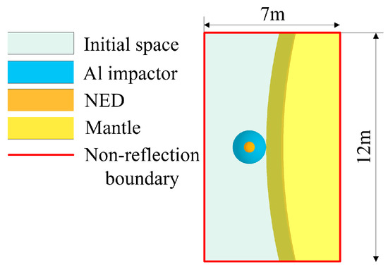The penetration depth of the impactor when the NED is initiated determines its initiation position. To ensure the credibility of the numerical simulation, it is necessary to determine the precise initiation time. Due to the significant difference in volume between the impactor and the asteroid, it is difficult to accurately describe the shock wave propagation and explosion product expansion using the full model. Therefore, in addition to the full structural model, we also build a mesh-refined local model, as shown in Figure 2. This model is a hexahedron of 12 m × 12 m × 7 m, and the red edge is the non-reflection boundary. In this model, the initial space is divided into 3,710,000 hexahedral elements, with a minimum side length of approximately 0.05 m. The impactor is divided into 155,520 hexahedral elements, with a minimum side length of approximately 0.01 m. The asteroid is divided into 1,716,104 hexahedral elements, with a minimum side length of approximately 0.04 m.