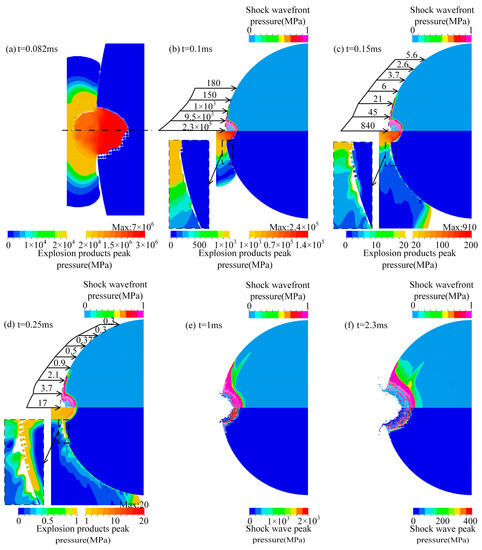 We first compared the simulation results of the mesh-refined local model and the full model at t = 82 μs to verify the reliability of the calculation. Figure 5 shows the process of expansion and pressure change of the explosion products in space, illustrating the loading mode of the explosion energy.