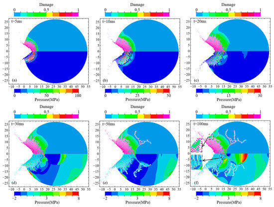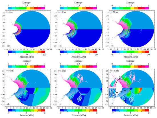 Damage evolution and pressure propagation of the asteroid under penetrating explosion: the upper half is the damage contour, and the lower half is the pressure contour. (a) the damage contour (upper part) and the pressure contour (lower half) of the asteroid at t = 5 ms; (b) the damage contour (upper part) and the pressure contour (lower half) of the asteroid at t = 10 ms; (c) the damage contour (upper part) and the pressure contour (lower half) of the asteroid at t = 20 ms; (d) the damage contour (upper part) and the pressure contour (lower half) of the asteroid at t = 30ms; (e) the damage contour (upper part) and the pressure contour (lower half) of the asteroid at t = 50 ms; (f) the damage contour (upper part) and the pressure contour (lower half) of the asteroid at t = 100 ms.