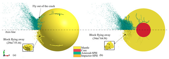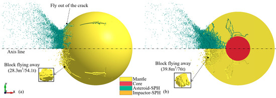 The damage morphology of the asteroid is described in Figure 7. The crack pattern and fragment distribution at t = 100 ms are shown, with the volume and mass of typical bulks marked (Figure 7). The upper part of the figure shows the particle distribution characteristics, while the lower part hides the particles, focusing on the flying elements and large blocks. There are large blocks around the crater, and we selected two of them for magnification and display to characterize the shape, volume, and mass of such large blocks. The penetrating explosion caused significant damage to the mantle, but the core was undamaged. There were many cracks in the mantle, but only a few cracks were observed on the outer surface of the asteroid, indicating that most cracks in the mantle did not extend to the surface. The cracks on the surface of the asteroid were not interconnected; therefore, this condition did not cause the mantle to break up. However, numerous cracks in the mantle caused the asteroid’s overall strength to be significantly reduced. At the head of the asteroid, almost all mantle elements failed. The core was covered with a layer of rubble with no strength, which undoubtedly increased the risk of core–mantle separation.