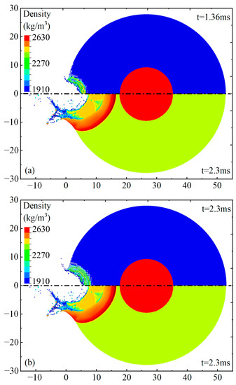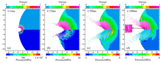 The lower part of Figure 5b–d shows the pressure attenuation of the explosion products and the damage process of the asteroid. Different pressure ranges were used to represent the pressure distributions of the explosion products in the crater and on the surface of the asteroid. As the propagation distance increases, the pressure of the explosion products decreases rapidly. The elements on the surface of the asteroid began to fail at t = 0.1 ms due to the pressure exerted by the explosion products, and the failure area expanded subsequently. From t = 0.1 ms to t = 0.25 ms, the pressure of the explosion products on the asteroid’s surface decreased from 2 GPa to 1 MPa. The expansion of the explosion products had acted on nearly half of the asteroid’s surface at t = 0.25 ms, and the failure area expanded further. At this point, the peak pressure of the explosion products in the crater was reduced to 20 MPa.