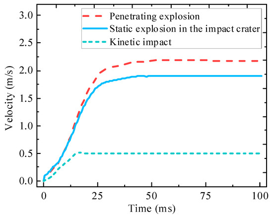 The results in Section 3.1 show that approximately 48.7% of the impactor momentum can be transferred to the asteroid, giving the asteroid a velocity change of approximately 0.24 m/s. Adding the velocity change of 1.9 m/s from the static explosion in the impact crater, the velocity change of the asteroid with a penetrating explosion is 2.14 m/s, which is marginally (2%) different from the numerical simulation results of this study. Therefore, accurate calculation results can be obtained by decoupling the penetrating explosion condition into two processes: kinetic impact and static explosion at the impact crater. In addition, the simulation result was less affected by the uncoupling of the explosion products with particles generated before NED initiation.
