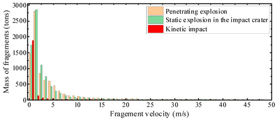 Under kinetic impact, the fragments have a lower total mass and lower velocity. The fragment velocity is concentrated in the range of 1–6 m/s, and the total mass is approximately 2.66 × 106 kg, accounting for 1.7% of the asteroid’s mass. The velocity distribution of the fragments under a static explosion in the impact crater was similar to that of a penetrating explosion. The fragment velocity was primarily concentrated in 1–20 m/s. The total mass of the fragments is approximately 9.38 × 106 kg under static explosion in the impact crater, accounting for 5.9% of the mass of the asteroid. This value is approximately 9.66 × 106 kg under a penetrating explosion, accounting for 6% of the mass of the asteroid. Most of the fragments with velocities below 3 m/s bounced off the crater. These fragments have the highest share of the total mass of the fragments, whereas the fragments generated during the material response stage have a higher velocity but lower mass share.