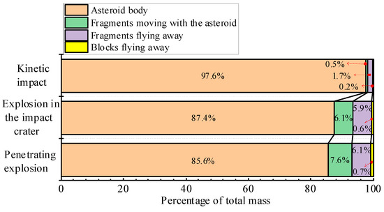Figure 15 shows the mass percentage of the asteroid body, flying fragments, flying blocks, and fragments moving with the asteroid to the total mass. The asteroid suffered the most damage under the penetrating explosion, resulting in the most fragments; 85.6% of the asteroid’s mass remained bound together. The flying fragments accounted for 6.1% of the asteroid’s mass, the fragments moving with the body accounted for 7.6% of the asteroid’s mass, and the large blocks flying away accounted for 0.7% of the asteroid’s mass. The kinetic impact causes minimal damage to the asteroid; 97.6% of the asteroid’s mass remains bound together. The flying fragments account for 1.7% of the mass of the asteroid, the fragments moving with the body account for 0.5% of the mass of the asteroid, and the large blocks flying away account for 0.2% of the mass of the asteroid.