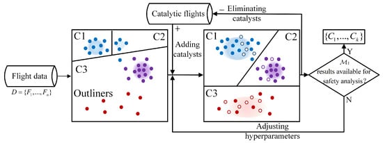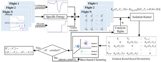 The process of performing CMCA is shown in Figure 1. First, the continuous and discrete flight variables are selected using various methods based on the energy analysis. Second, the dissimilarity matrix is obtained by calculating the isolation dissimilarity of N flights and P catalysts. Then, the mass-based clustering is implemented, in which the hyperparameters are adjusted until the optimization goal is satisfied and the labeled group-scale precursors can be acquired.