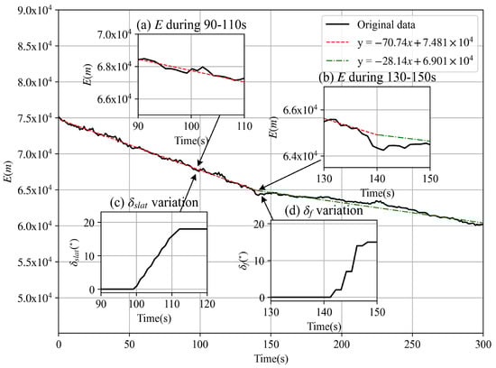 An example of discrete variable selection is depicted in Figure 2, where the variation in the specific total energy during the 300 s flight is presented. Figure 2a,b show the energy response in more detail during the 90–110 s and 130–150 s intervals. The black line represents the total specific energy, and the red and green dotted lines depict the fitted lines based on data from the 0–140 s and 140–300 s periods, respectively. At 140 s, the flap angle changed from 0 degrees to 15 degrees, as shown in Figure 2d, followed by a decrease in the energy-reducing rate. Additionally, the influence of the slat angle, which changed at about 100 s, as shown in Figure 2c, was almost negligible in energy.