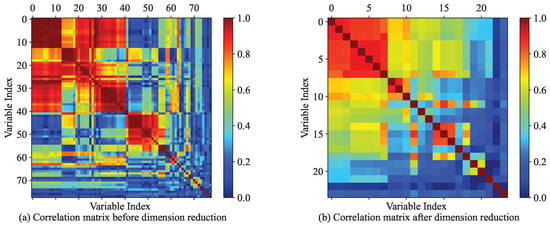 Algorithm 1 and the discrete parameter selection method described in Section 2.1 were applied to select the most relevant variables first. As a result, 23 continuous and 4 discrete features were extracted from an original number of 78 variables recorded in the flight data. As shown in Figure 4a, there was high collinearity among the 78 variables, with the axis representing the parameter index ranging from 0 to 77. However, after decorrelation, significant improvements were observed, as shown in Figure 4b, where the axis represents the new variable index ranging from 0 to 22.