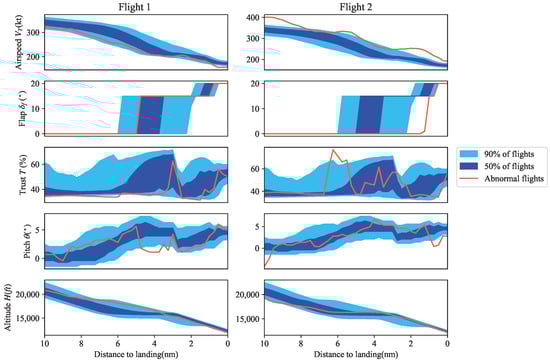 For Flight 1, it can be observed that certain parameters deviated from nominal flight conditions, which resulted in a lower speed at 1000 ft above touchdown (shown on the right-hand side of the horizontal axis). This deviation from typical flight conditions could potentially indicate an issue with the aircraft’s power, altitude, or other critical parameters. In contrast, Flight 2 exhibited significant deviations from typical flight conditions, with the parameters exceeding the boundaries of 90% of all flights. Specifically, improper operation of the thrust, flap, and pitch angle occurred around 2 nm from the runway, causing a high-energy approach and a typical high-risk event.