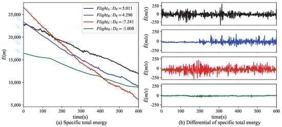 To evaluate the effectiveness of our proposed metric in distinguishing between different flights during approach, four flights were analyzed, and the results are presented in Figure 6. Figure 6a shows the specific total energy and Figure 6b shows the differential value of the acceleration of energy .