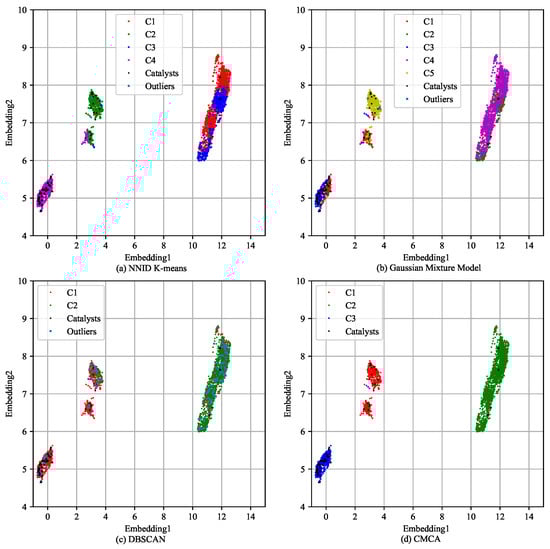 The clustering results of the baseline algorithms and CMCA are presented in Figure 7. Specifically, we reduced the high-dimensional flight data to two dimensions (named Embedding1 and Embedding2) using t-SNE for better presentation while preserving as many of the pairwise similarities between the data points as possible. The axes correspond to the values of the two features extracted through t-SNE.