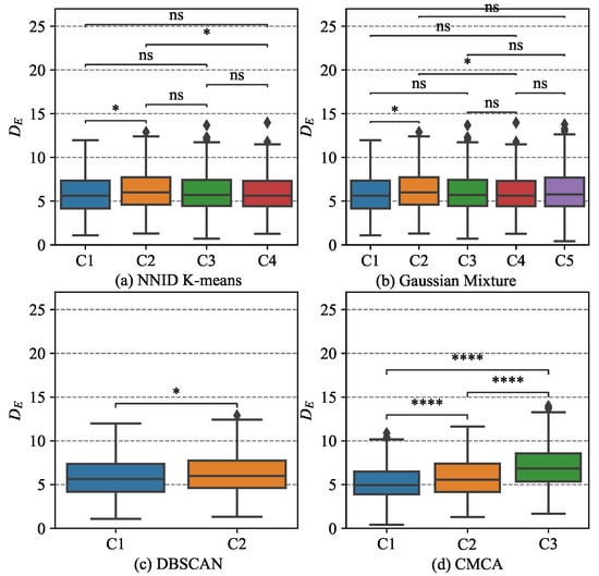 As shown in Figure 8, the results reveal that the three clusters identified by CMCA exhibited significant differences (p < 0.00) in terms of , indicating that they may correspond to different levels of performance during approach. As for the other methods, it is evident from Figure 8a that only the indices between C1 and C2, and C2 and C4 demonstrated significant differences (p < 0.05) in performance during approach according to further non-parametric Mann–Whitney testing. This implies that other clusters could not be distinguished based on performance during approach. Similarly, only the differences between C1 and C2 and C2 and C4 were remarkable, which can be seen in Figure 8b. As seen in Figure 8c, although the two clusters in Algorithm 3 differed, the substantial data imbalance between C1 (3357) and C2 (101) significantly influenced the test results. These findings suggest that CMCA can provide reliable insights into the safety implications of different flight states and can be a valuable tool for identifying group-scale precursor issues.