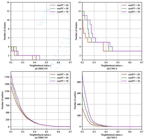 To further analyze the influence of the hyperparameters, a sensitivity analysis of Algorithm 3 and CMCA was carried out, and the results are shown in Figure 9, where the horizontal axis represents the value of and the vertical axis represents the number of clusters corresponding to a certain and . The number of flights in the top four clusters and the outliers are shown in Table 1.