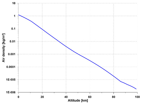 The International Standard Atmosphere model, as well as U.S. Standard Atmosphere [33], includes altitudes up to 86 km. The model embedded in SDSA (Simulation and Dynamic Stability Analysis, ver. 2020, rev. 1004) software [30,34] originally was limited to higher stratosphere. Simulations conducted in this paper required much higher levels, so the model was extended. Air density, which for higher levels is drastically smaller, is crucial. The change in air density as a function of altitude presented in Figure 4 shows that air density at the highest level is about a million times less than air density at sea level. During all simulations, the atmospheric condition was assumed as calm (no turbulence).