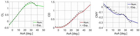 During the tests, data such as lift, drag, and pitching moment coefficients were collected at a free stream velocity of 40 m/s, corresponding to the Reynolds number of about Re = (calculated based on the MAC of the wing). The measurements were taken in an aerodynamic coordinate system for the reference point, which was located at 21% of the wing MAC, the assumed center of gravity position of the rocket plane. All characteristics were measured for the range of angles of attack from −5° to +40° [32]. Experimental investigations for higher AoA and/or higher Mach numbers were not possible due to facility limitations.
