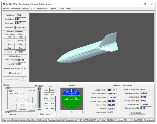 Simulation calculations were performed using the SDSA [30,34] software, in which a full non-linear 6DoF model of the aircraft motion was implemented (Figure 8). The flight parameters can be recorded for further postprocessing. The input consists of aerodynamic and control characteristics (all components), and geometry and inertia data.