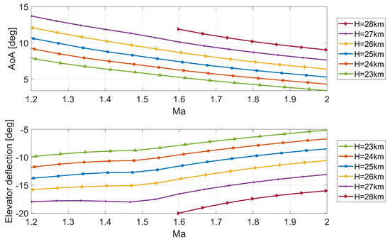 The results of trim calculations for the supersonic speed regime for the altitude between 23 to 28 km are presented in Figure 10. The results were calculated using SDSA software which solved the problem of equilibrium of forces and moments. The maximum elevator deflection (simultaneous deflection of elevons and side plates) is equal to −20° (both elevons and side plate are deflected by −20°. Obtaining the trim condition within considered Ma range, for altitude equal or higher than 29 km would require bigger elevator deflection than it can be obtained. The elevons are deflected up while the trailing edge of each side plate is rotated inward; therefore, the deflection is limited due to a possible crash of control surfaces.