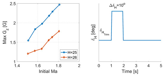 The simulation results of rocket plane response to control are presented in Figure 11 (plot on the left). The simulations were performed by the SDSA software under the assumption that at time equal to zero the rocket plane is in trim condition for a selected speed (initial Ma) then after 1 s, the elevator was deflected by 10°, as presented in Figure 11 (plot on the right). During the simulation, the maximum value of the G-load in z direction, caused by the elevator deflection was recorded. This impulse function represents a brutal control case.
