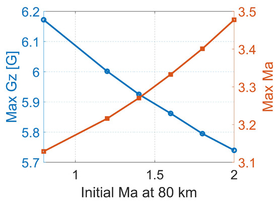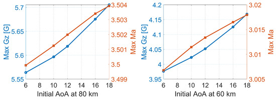 In the next step, the focus was on the analysis of the impact of the initial AoA and pitch angle on the maximum flight parameters (Ma, G-load). The simulation results are summarized in Figure 17 and Figure 18. The effect on the Mach number is negligible, while a minor effect on the G-load can be observed, regardless of the considered altitude (80 km or 60 km). Taking into account the FAA recommendation, the effect on G-load is not satisfactory.