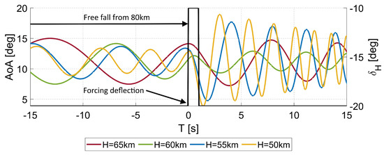 Rocket plane response to control. All simulations begun at 80 km and Ma = 2.0; then, the elevator deflection was commanded on a different altitude between 50–65 km.