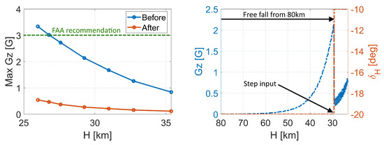 The oscillations that were induced have no effect on the maximum G-load; therefore, to investigate a possibility of its reduction, simulations of step elevator deflection were performed. The results of maximum G-load recorded before and after the step deflection are presented in Figure 21 (graph on the left), while an example of the G-load distribution for the response to a step control is shown in graph on the right.