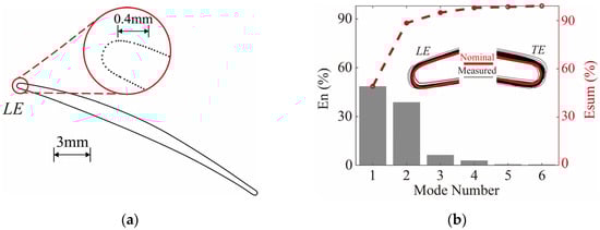 where indicates the -th eigenvalue. As observed in Figure 1b, the first four modes of the manufactured blade profiles contained 96.79% of the accumulated geometric variance. Figure 1b also shows the geometries near the leading edge and trailing edge of the 98 real blade profiles. Therefore, the real geometry could be accurately characterized using the deviation modes along the first four eigenvectors. The reconstructed deviations could be obtained by projecting the real deviations onto the first four modes and then replacing in Equation (4) with the projected values. The deviations on the reconstructed blade profiles were more than 96% similar to the real deviations.