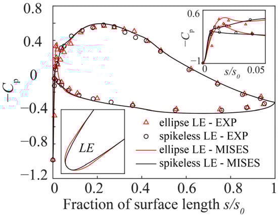 The aerodynamic performance of all blade profiles was numerically solved using the Multiple-blade Interacting Stream-tube Euler Solver (MISES) program. MISES solves inviscid and steady Euler equations with a coupled integral compressible boundary layer computation on a two-dimensional H-grid. During the solving process, the grid was adjusted automatically to ensure that all points of each grid element were on streamlines. In addition, the first layer grid was located at the boundary layer displacement thickness close to the surface. MISES has been thoroughly calibrated in subsonic and transonic flows [29]. Considering its high reliability and fast solving speeds, this program has been widely used for determining performance uncertainty [30,31]. In this study, Table 1 shows the grid settings in the MISES program. The method was used to compute the transition onset of a separated flow. Figure 2 illustrates the contrast between the MISES computational results and the experimental results for two blade profiles with different LE geometries [32]. In Figure 2, the static pressure rise coefficient was defined as follows: