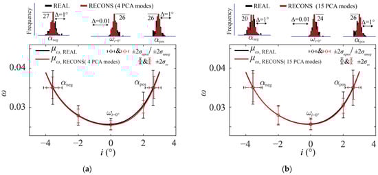 Figure 3 shows the aerodynamic performance of the 98 real and 98 reconstructed blade profiles produced using the PCA method. The solid lines represent the mean values of the profile loss (). The error bars centered at the mean represent two-time standard-deviation intervals of the profile loss (); the positive and the negative incidence ranges ( and ), respectively. The mean value obtained using the reconstructed profiles was very close to that of the real blade profiles. However, the standard deviation for the real profiles were larger than those obtained using the reconstructed profiles. The result indicated that the main challenge with deviation modeling using the PCA method was the underestimation of aerodynamic performance variance. This phenomenon occurred because the PCA method is totally geometry-based, giving no consideration to the aerodynamic sensitivity. This conclusion was drawn based on the performance of 98 blade samples, but may be questioned due to the statistical convergence issues. In Section 5 of this article, a detailed discussion will be provided on the statistical convergence issue, and the correctness of this conclusion will be demonstrated through statistical inference and Monte Carlo simulations.