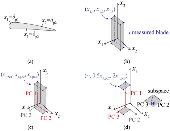 Figure 4 illustrates the process of the mode selection in the SCPCA method. Assuming that there are three positions (p1, p2, and p3) shown in Figure 4a for measuring blade deviations, the normal deviations for each measured blade at these three positions were represented as -coordinate values. Then, each measured blade could be represented as a three-dimensional coordinate point depicted in Figure 4b. Assuming that a total of eight real blades have been measured, so, the eight blue dots can be drawn in Figure 4b. In this context, the problem of deviation modeling concerns how to use a smaller number of variables so as to describe the original 3-dimensional deviation data. Figure 4c shows the deviation modes identified using the PCA method. Since the projection of the original deviation data onto the first principal component (PC 1) and the second principal component (PC 2) had a large scatter, the PC 1 and PC 2 (marked in red in Figure 4c) have been selected in the PCA method when choosing two modes for deviation modeling. In the orthogonal coordinate system composed of principal component eigenvectors, the coordinate has been transformed into the coordinate . The vector , defined in the last paragraph, was located in the subspace spanned by PC 2 and PC 3, as shown in Figure 4d. In this figure, the projection value of onto PC 2 was assumed to be twice that onto PC 3. The projection values of can reflect the magnitude of the angle between and the eigenvectors. Then, using these projection values as weighting factors of PC 2 and PC 3, the original measured data can be scaled along each eigenvector. Based on the variance of the scaled data, the eigenvector with the greater impact on the performance could be determined. Appendix A provides a detailed explanation of the rationale behind using projection values for data scaling and sorting the scaled data according to variance. In Figure 4d, PC 3 was the eigenvector that had the greatest impact on the performance, rather than PC 2, despite PC 2 being ranked higher in the PCA method. Therefore, when selecting two modes for deviation modeling, the PC 1 and PC 3 (marked in red in Figure 4d) have been selected in SCPCA method.