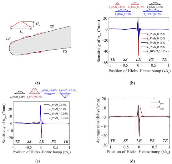 Schematic of calculating the sensitivity of the positive incidence range: (a) placing Hicks–Henne bumps; (b) placing bumps of different widths; (c) placing bumps of different heights; (d) average sensitivity.
